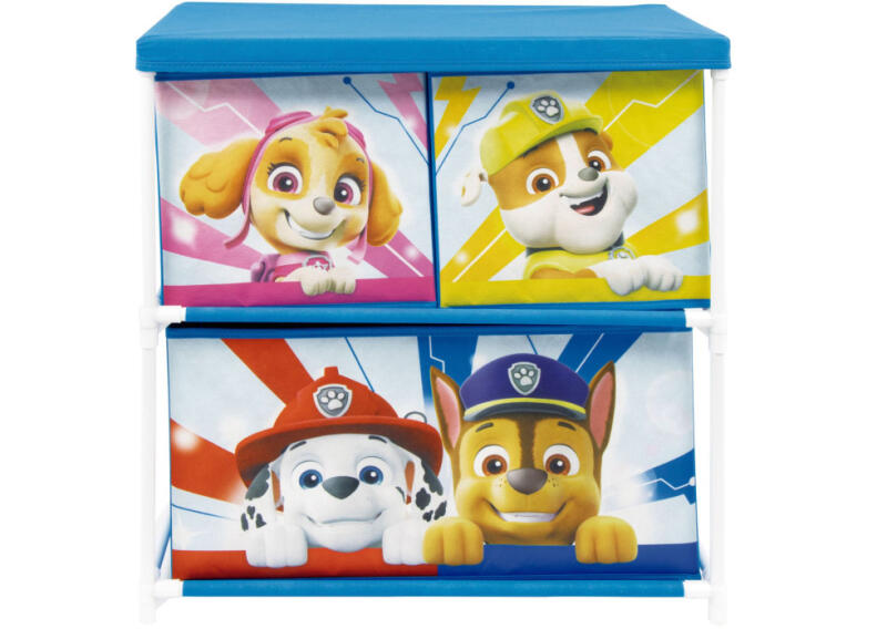 Paw Patrol, Mancs Őrjárat játéktároló állvány 3 rekeszes Mérete: 53x30x60 cmTárolók:- 2 db 30x24x24 cm- 1 db 30x48x24 cm Anyaga: fém, műanyag, poliészterEz a bútor ideális ruhák, játékok rendezett tárolására. Kis helyet foglal, gyorsan összeszerelhető.